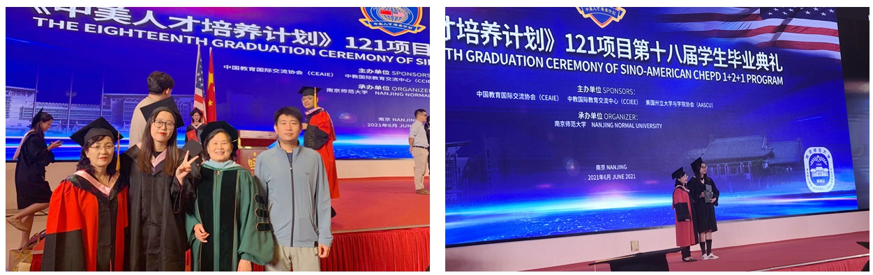 本网讯(特约记者 王健)6月22日,《中美人才培养计划》121项目第十八届学生毕业典礼在南京举办,文化旅游学院院长潘华、国际交流合作处处长郑羽现场为我校毕业生颁发了学位证书。今年,学校共有3位学生顺利毕业,其中2名学生获得了“优秀毕业生”荣誉称号。