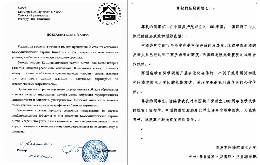 在中国共产党成立100周年之际,与我校友好交往的俄罗斯布拉戈维申斯克国立师范大学、俄罗斯阿穆尔肖洛姆·阿莱赫姆国立大学、俄罗斯乌拉尔国立师范大学、俄罗斯阿穆尔国立大学、俄罗斯远东国立农业大学纷纷向我校发来贺信,祝贺中国共产党成立100周年。