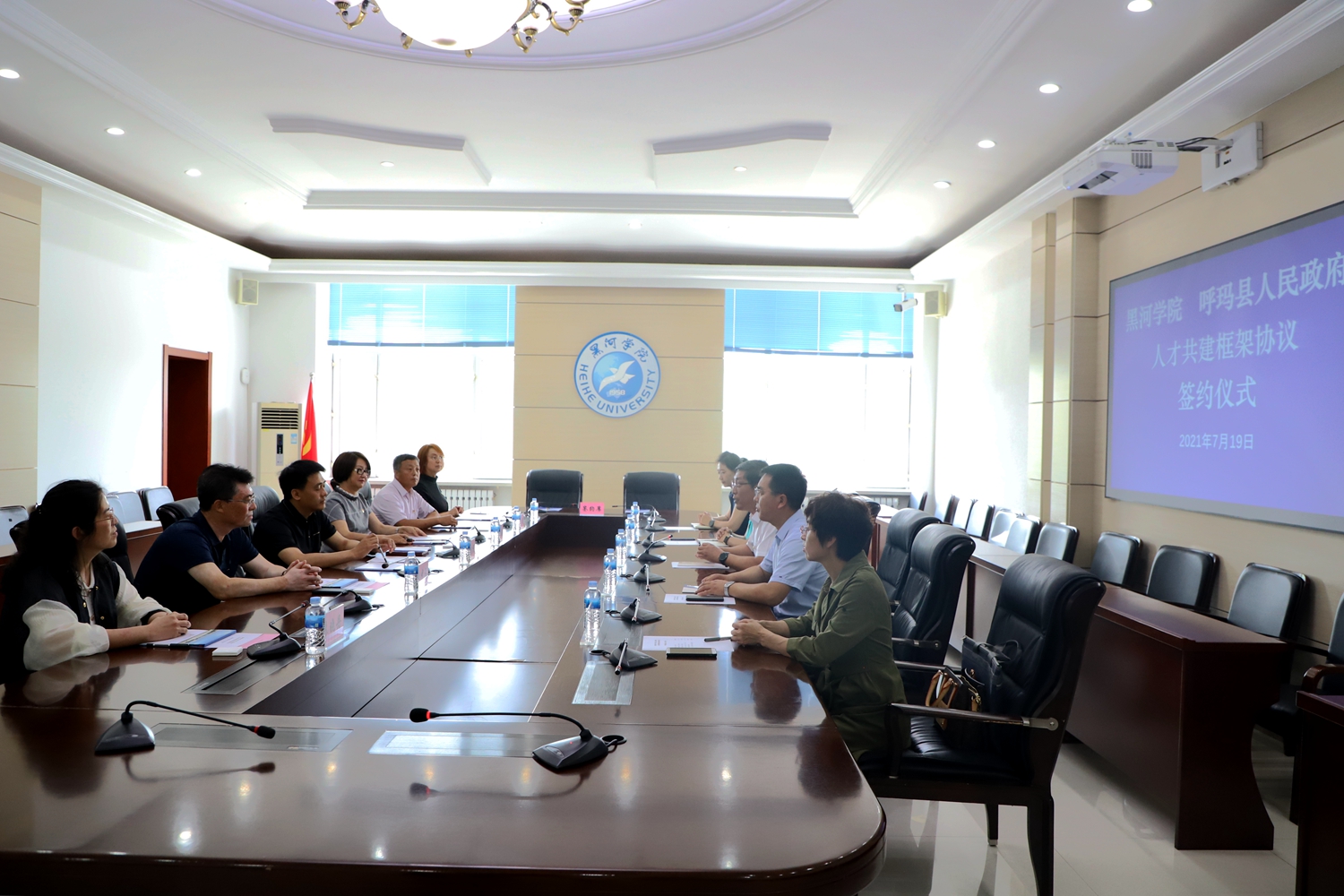 本网讯(记者 关月)7月19日,我校与呼玛县人民政府人才共建框架协议签约仪式在明德楼二楼会议室举行,未来校地合作双方将深度对接资源优势,加大人才培养引进力度,共同推动呼玛县转型发展,实现校县双方合作双赢发展。呼玛县政府县长魏志民,县委常委、宣传部长赵洁,县委常委、组织部长王中尉,县委组织部副部长苏晓丹,县人力资源和社会保障局局长王金英,学校驻村第一书记冯笑;我校党委副书记、工会主席张焕强,党委委员、组织部部长安全义及教务处、招生就业处负责人参加签约仪式。