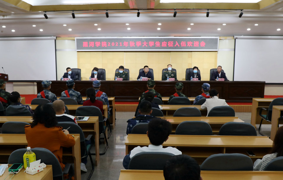 卢文友处长宣读了黑河学院2021年秋季应征入伍学生名单及分配方向;与会领导为应征入伍学生佩戴红花并颁发纪念品。