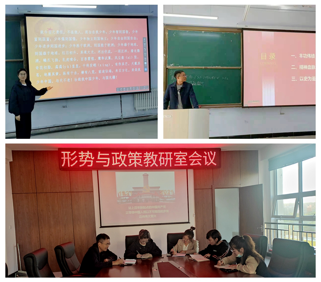 马克思主义学院以学习贯彻习近平总书记“七一”讲话精神作为重要主题,通过形势与政策课开设“奋斗百年路,开启新征程”专题教学。开课前,教研室开展集体备课,共同回看“七一”大会实况,集中阅读、研习习近平总书记“七一”重要讲话,力求将中国共产党百年奋斗的辉煌成就讲深刻,将伟大建党精神讲透彻,将“九个必须”的重大要求讲清楚。课堂上,师生们围绕中国共产党“开天辟地、改天换地、翻天覆地、惊天动地”的丰功伟绩展开热烈研讨;用一个个党史上感人而鲜活的故事阐释着“中国共产党的精神之源——伟大建党精神”。同时,依托线上教学平台,结合专题学习,布置了主题为“青年要将青春和奋斗融入党和人民事业”的实践作业,同学们用真挚的情感、朴素的语言发表着自己的学习感受,进一步深化了对讲话精神实质的理解。