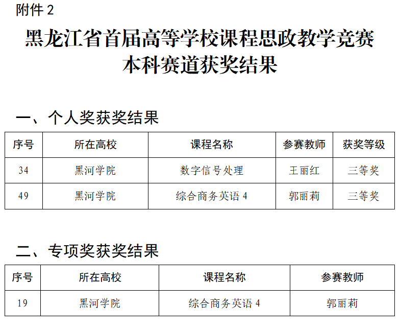 本网讯(特约记者 王虹丹)近日,黑龙江省教育厅发布《黑龙江省教育厅关于公布黑龙江省首届高等学校课程思政教学竞赛获奖结果的通知》,我校外国语学院郭丽莉老师讲授的《综合商务英语4》获本科赛道三等奖,并获优秀教学设计案例专项奖;计算机与信息工程学院王丽红老师讲授的《数字信号处理》获本科赛道三等奖。