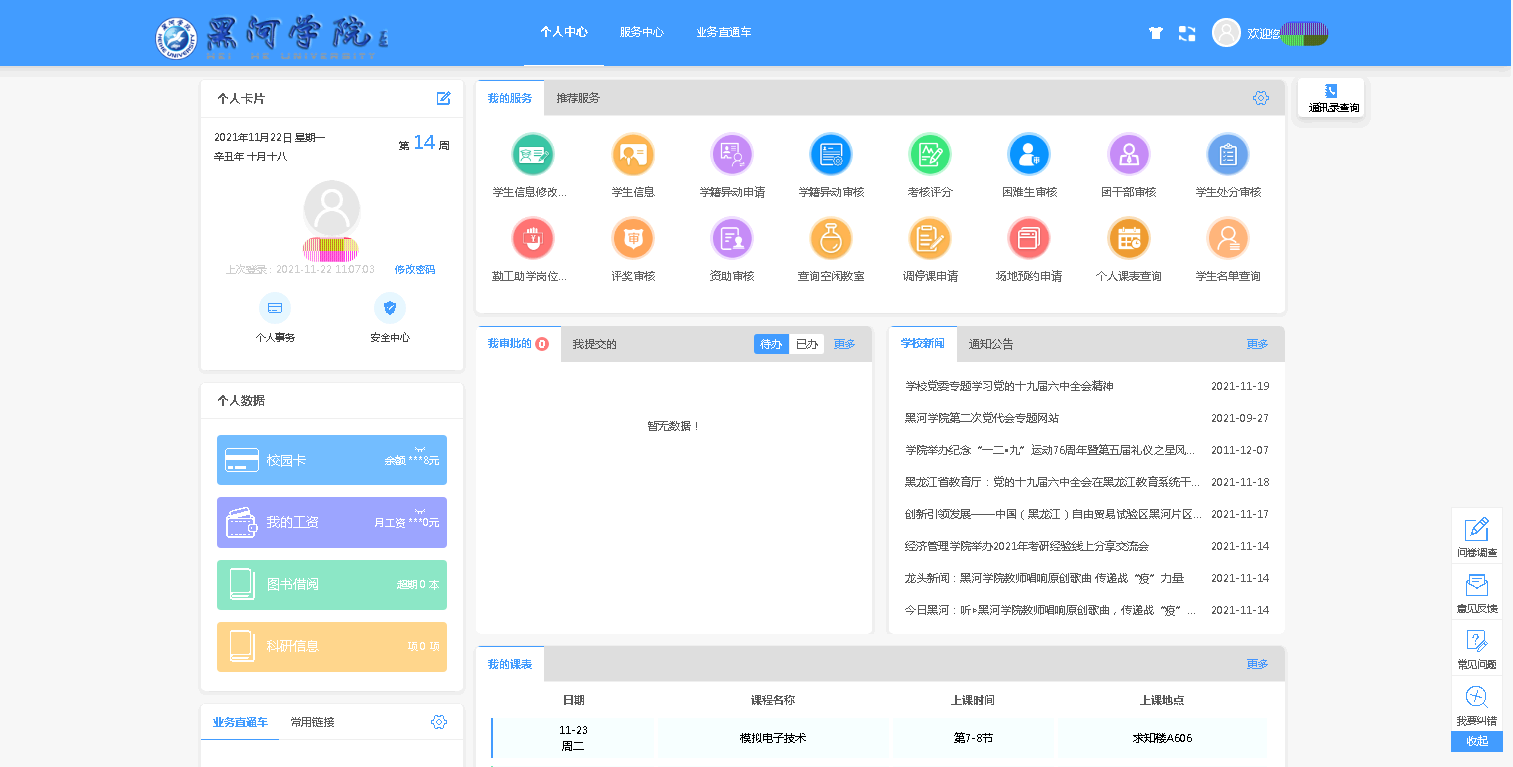 “十三五”以来,在学校党委的大力支持和各相关部门的积极配合下,学校信息化建设工程项目领导小组压实责任、统筹推进工程各项建设工作。截至目前,“智慧校园统一平台”已完成与教务系统、教学质量保障系统、学工系统、团委系统、审计系统、财务系统、一卡通系统、图书系统的对接工作,与OA系统、人事系统(试用)的对接工作正在有序进行中。以教师身份登录统一平台后,既可实现工资查询、一卡通余额查询、图书借阅查询、课表查询、学校新闻和通知查询等基础查询功能,又可完成21个服务事项的在线办理;以学生身份登录统一平台后,既可实现一卡通余额查询、图书借阅查询、课表查询、教务通知查询、学工通知查询等基础查询功能,又可完成17个服务事项的在线办理。