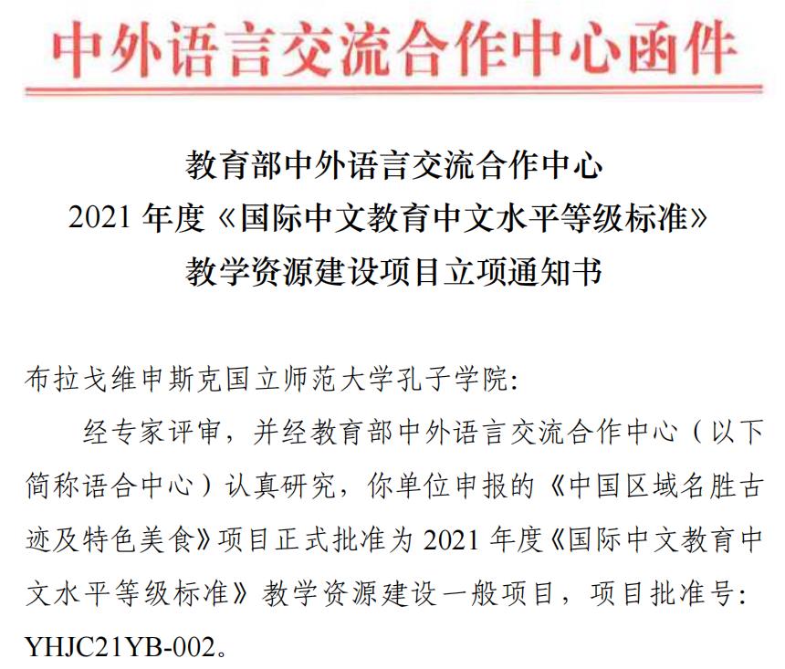 近日,教育部中外语言交流合作中心公布了2021年度《国际中文教育中文水平等级标准》教学资源建设项目立项结果,我校王晓梅教授申报的“中国区域名胜古迹及特色美食”项目正式批准为2021年度《国际中文教育中文水平等级标准》教学资源建设一般项目,项目批准号:YHJC21YB-002,批准经费:10万元整。这也是我校首次获批教育部中外语言交流合作中心组织的国际中文教育研究课题。