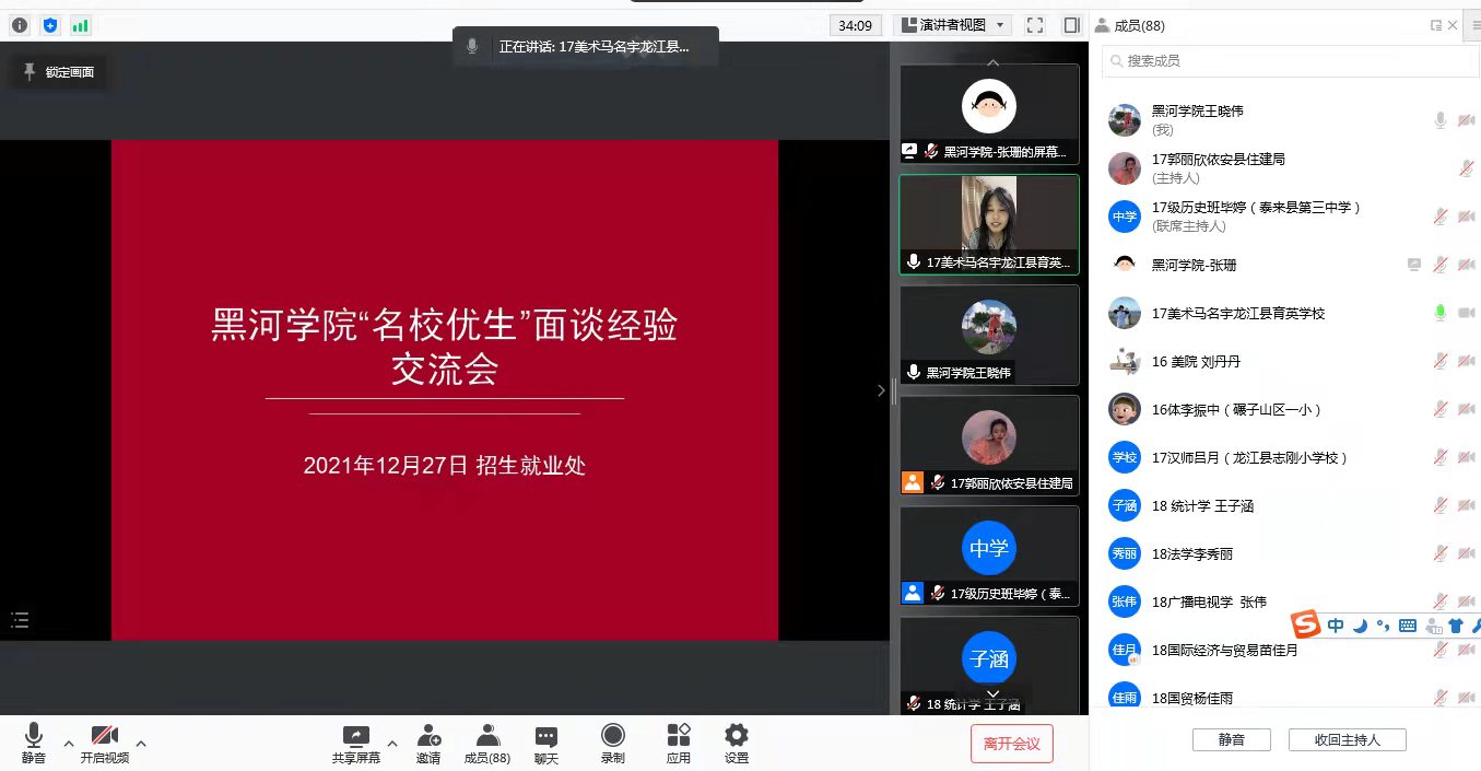 本网讯(特约记者 王晓伟)为帮助进入面试环节毕业生详细了解“名校优生”相关政策,提升毕业生面试技巧,促进毕业生就业,12月27日,招生就业处利用腾讯会议举行了“名校优生”面试经验交流会。招生就业处、各相关学院相关负责人、往年考取齐齐哈尔市“名校优生”的校友代表及今年进入“名校优生”面谈环节的58名2022届毕业生及家长百余人参加会议。