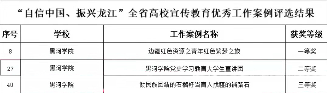 本网讯(记者 王静)近日,黑龙江省高校网络思想政治工作中心公布全省高校“自信中国、振兴龙江”宣传教育优秀工作案例征集活动评选结果,我校经过广泛征集、认真遴选,推荐报送的《边疆红色资源之青年红色筑梦之旅》《黑河学院党史学习教育大学生宣讲团》《做民族团结的石榴籽当育人戍疆的铺路石》三项案例分获一、二、三等奖。