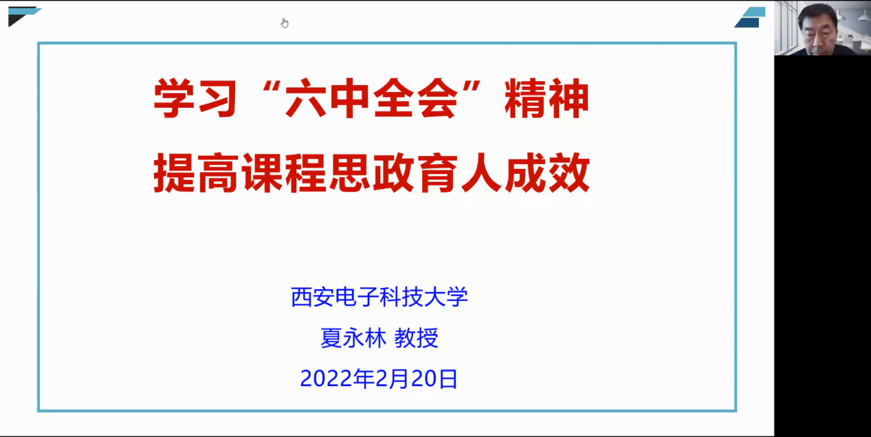 学校特邀西安电子科技大学马克思主义学院党委书记夏永林教授开展了题为“学习‘六中全会’精神提高课程思政育人成效”的专题讲座。夏教授从当前高校课程思政育人的现状出发,全面阐述了提升课程思政育人的有效路径,引导教师重点通过学习领会十九届六中全会精神,深入推进课程思政教学改革,在授课过程中充分发挥学校红色资源作用,进一步挖掘思政元素,不断创新育人手段,切实提升课程思政育人成效,全面推进课程思政建设。