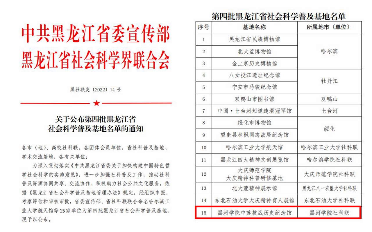 本网讯(特约记者 彭传怀)近日,中共黑龙江省委宣传部、黑龙江省社会科学界联合会下发《关于公布第四批黑龙江省社会科学普及基地的通知》(黑社联发〔2022〕14号),黑龙江省委宣传部、黑龙江省社会科学界联合会联合命名15家单位为第四批黑龙江省社会科学普及基地,我校申报的“中苏抗战历史纪念馆”成功获批,这是我校首次获批省级社会科学普及基地。