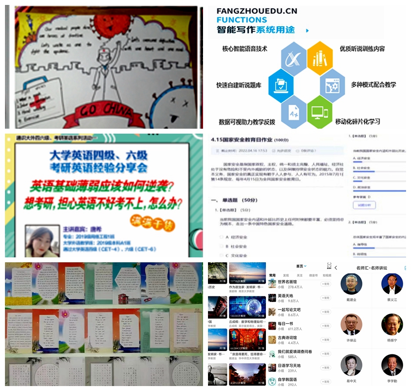 通识教育学院对大学外语、大学语文、军事理论、健康教育课程和大学生就业指导等基础课程进行了精心设计,力争建课程、精技能、育成果。充分利用“易写作”“讯飞(FIF)”等各类媒体教育系统资源,构建智慧实践教学平台,制作英语手抄报、英语课件、录制抗疫英语短视频等实践活动,开展大学英语四六级、考研英语学习辅导系列讲座,大学外语的课堂上,学生们“抬起了头”“张开了嘴”“提起了笔”。