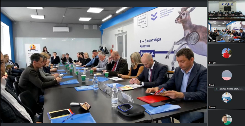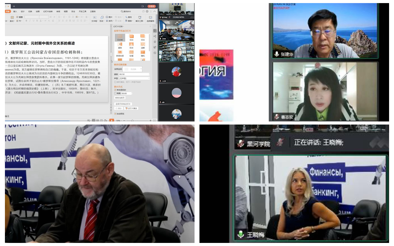 本网讯(特约记者 张雪梅 摄影 郭瑞)5月26日,由中国黑河学院、俄罗斯布拉戈维申斯克国立师范大学联合主办,我校外国语学院、远东研究院、黑龙江省俄罗斯东欧中亚学会俄罗斯学研究分会、黑龙江省中俄历史与文化学术交流基地承办的第十二届“中俄合作历史与前景”学术研讨会在线上顺利召开。来自中国社会科学院、北京师范大学、黑龙江大学、黑龙江省社会科学院、黑河学院、莫斯科国立大学、圣彼得堡国立大学、俄罗斯科学院、布拉戈维申斯克国立师范大学等9所中俄高校和科研院所的专家学者与会。学校党委副书记、院长杨敬民,副院长谢慧及外国语学院、远东研究院、国际交流合作处负责人与相关学科专业教师代表在明德楼二楼会议室参加会议。