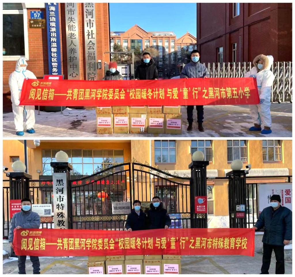 据悉,校园暖冬行动于2021年底启动,由新浪新闻、微博校园联合中国扶贫基金会发起的阅见信箱校园暖冬行动公益活动,通过在新浪新闻客户端回答少年儿童问题,帮助山区留守儿童打开视野,满足少年儿童对广阔世界的渴望,帮助少年儿童看见更旷阔的世界。校团委、校学生会积极参与,在公众平台发起“校园暖冬行动”活动,经过广大师生积极参与,我校获得“阅见信箱•校园暖冬行动”榜首,并收到新浪微博提供的暖冬大礼包。按照校园暖冬行动活动要求,我校第一时间将暖冬物资送往黑河市特殊教育学校和黑河市第五小学,为孩子们送去了冬日的温暖,暖冬大礼包不仅是物质关怀、新年祝福,更是黑河学院师生对学生们的牵挂与支持。