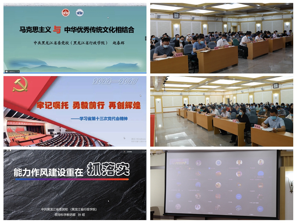 本次培训内容丰富,形式多样,采取专题辅导、自学等多种途径以“线上+线下”相结合的方式进行。培训特邀中共黑龙江省委党校(省行政学院)社会与文化教研部主任赵春辉教授、马克思主义学院执行院长亓利教授、领导科学教研部主任孙昭教授为与会人员作专题报告,全面系统地学习习近平总书记在党的十九届六中全会上的重要讲话精神、《中共中央关于党的百年奋斗重大成就和历史经验的决议》和省第十三次党代会精神;学习习近平总书记关于建设高素质专业化干部队伍的重要论述要求以及党性修养、党建理论与实践、党员干部能力作风提升等内容。在紧张而充实的学习中,全体学员认真学习,学悟结合,圆满完成了学习任务,切实筑牢了信仰之基、补足了精神之钙、把稳了思想之舵。
