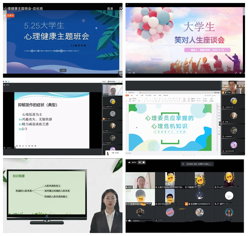 在大学生心理骨干培训班开班式上,普及心理健康知识,引导学生认识心理健康的重要性;在心理主题班会上,通过沟通和交流,提高大家对常见心理问题的识别和鉴别能力;在微课比赛环节,全校4个年级150名学生围绕“积极心态”“和谐人际”“恋爱与成长”主体展开心理案例分析,挖掘了学生个人潜能,提升了专业素养和实践能力;在线上团体心理辅导课上,学生工作部心理咨询中心刘恋、王希顺老师分别以“积极心态”和“人际关系发展”为题,通过故事接龙、情绪绘画、天生我材等方式,鼓励学生努力学习、积极体育锻炼,在抗击疫情的不断磨砺中愈发坚韧,在追求梦想的不懈挑战中健康成长。此外,各学院结合专业特点和自身资源,开展了系列特色活动。