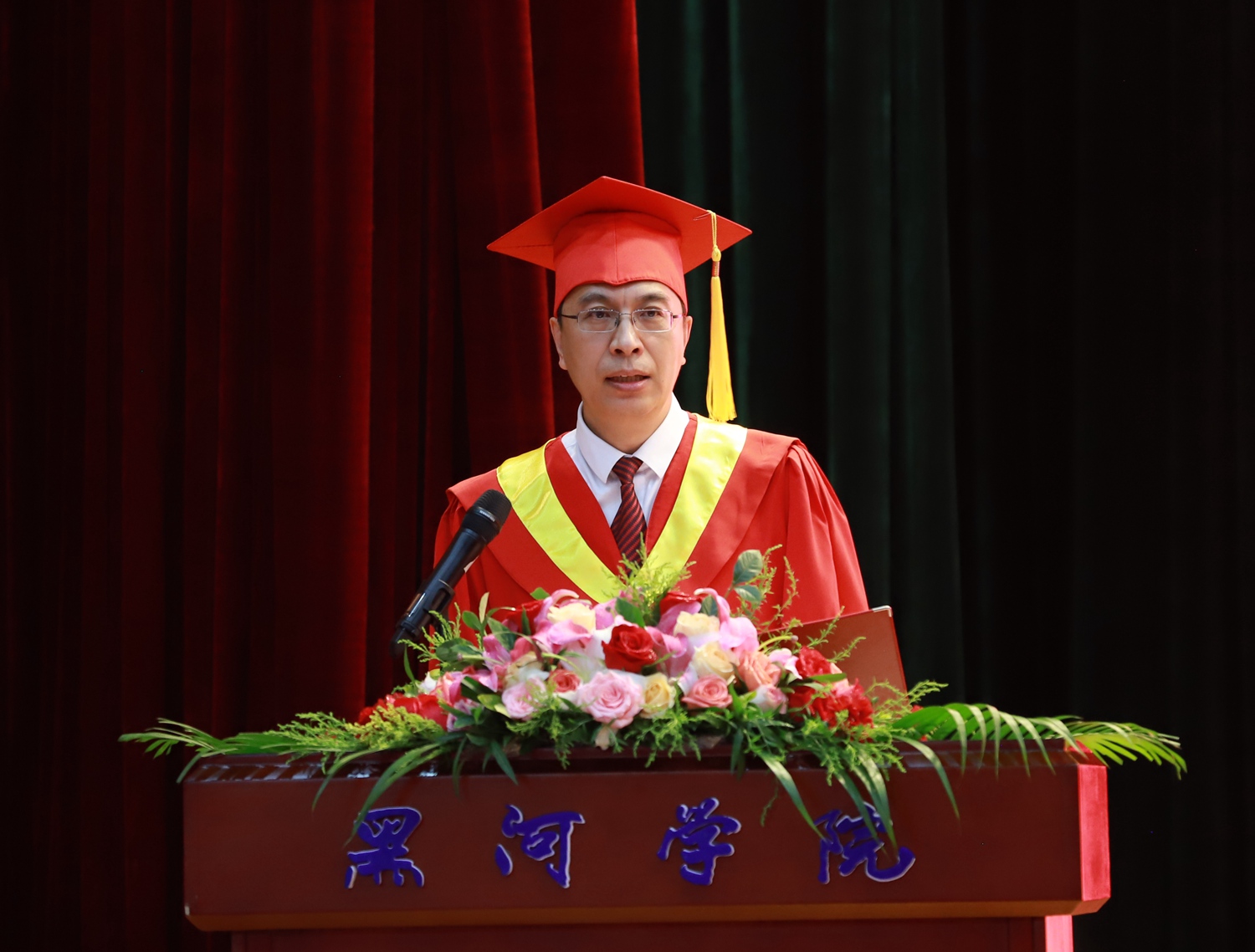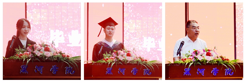 在校生代表孟思雨向即将毕业的学长学姐们表达了美好祝愿,感谢学长长期的鼓励和支持,并承诺要以学长为榜样,勤于实践,积极进取,用青春和智慧续写新的篇章;毕业生代表商启回顾了丰富多彩的四年大学生活,分享了自己的成长和收获,承诺将继续秉承“明德、笃行、励志、求真”的校训精神,乘风破浪,勇往直前,以优秀的成绩彰显黑河学院学子的风采。教师代表孙成业教授鼓励大家要珍惜这个伟大的时代、致敬伟大的祖国,不负青春年华,始终保持终身学习的动力,把双脚踩在泥土里,踏踏实实走好每一步,在平凡中追求卓越,心爱祖国,奉献国家,努力实现自我价值。