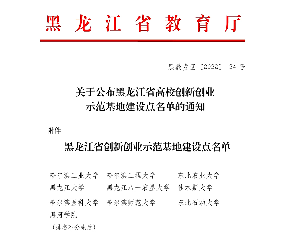 本网讯(特约记者 姜辉)近日,黑龙江省教育厅公布了“黑龙江省高校创新创业示范基地建设点”名单。结合我省实际聚焦数字经济、生物经济、装备制造、创意设计、现代农业、对俄经济等领域,经专家综合评议,省教育厅认定了10个高校创新创业示范基地建设点,我校获批“黑龙江省高校创新创业示范基地建设点”单位。