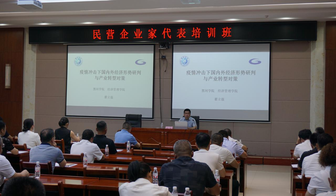 翟立强从疫情对世界经济、国内经济造成的影响,我国经济高质量发展的成效及产业转型对策三个方面进行阐述,重点向学员们讲解了疫情对全球价值链、供应链产生的冲击,传统的低成本优势在全球价值链重构中的地位下降,跨国公司在贸易投资、供应链安全、保持企业竞争力之间寻求平衡。希望黑河市民营企业家抢抓数字经济、中俄数字贸易、现代绿色农业等领域的发展机遇,充分利用好国家支持政策,积极融入国内国际双循环发展战略以应对疫情带来的挑战。