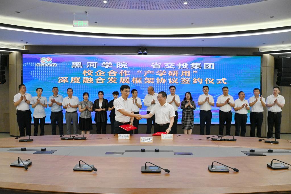 杨弘宇在介绍了人才培养、科学研究、社会服务、国际交流合作等方面基本情况后指出,黑龙江省交投集团作为黑龙江省知名国有企业,一直深耕黑龙江交通产业发展,在政校企产学研创用方面具有天然优势和独特地位,而黑河学院作为中俄边境线上我国境内唯一一所普通高等本科院校,一直坚定不移地走“地方性、综合性、应用型、国际化”发展道路。特别是近年来,学校加大专业结构调整力度,优化专业布局,着力建设能够支撑我省现代产业集群的学科专业体系,有效提升应用型人才培养与产业需求的契合度,不断彰显促进我省经济社会发展的支撑性价值。黑河学院与黑龙江省交投集团强强联合,必定具有广阔的合作发展空间和美好前景。