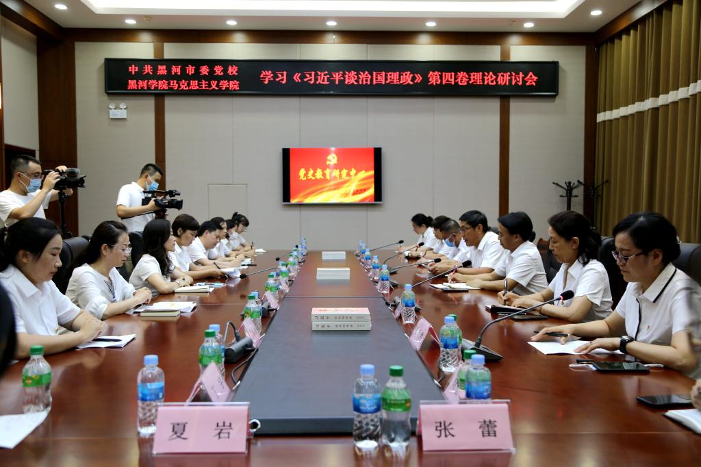 本网讯(特约记者 张巍)8月2日,马克思主义学院与中共黑河市委党校以共建党史研究中心为平台,举办《习近平谈治国理政》第四卷理论研讨会,切实做到先学一步、深学一层。学校党委副书记、工会主席张焕强,马克思主义学院院长姜丽萍,中共黑河市委党校校长李百青及党史研究中心教师代表参加学习研讨。