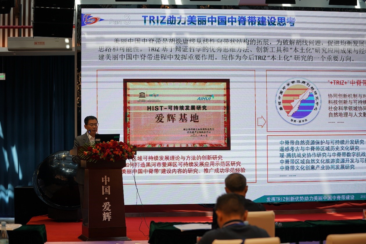论坛上,曹福全教授围绕“发挥TRIZ创新优势,助力美丽中国中脊带建设”作主题报告,详细介绍了经典TRIZ的基本内容;TRIZ“本土化”研究应用的一般方向和主要成果;给出了TRIZ有利于建立对美丽中国中脊带建设的系统认知、有助于揭示美丽中国中脊带建设发展的科学趋势、有助于准确定位美丽中国中脊带建设中的问题及根源、有助于快速找到解决美丽中国中脊带问题的有效资源的四大主要作用。他指出,美丽中国中脊带是胡焕庸线从线性向带状结构的拓展,为破解胡线问题,促进均衡发展提供了新的思路和可能性。黑河学院是“可持续发展爱辉研究基地”的组成部分,TRIZ基于辩证哲学的优秀思维方法、创新工具和“本土化”研究应用成果与经验,将在构建美丽中国中脊带进程中、发挥重要作用,应作为今后TRIZ“本土化”研究的一个重要方向,深入开展区域可持续发展理论与方法的创新研究、开展如何打造黑河市爱辉区可持续发展应用示范区研究、推动“美丽中国中脊带”建设内容的研究、推广成功示范经验,为成立“美丽中国中脊带协同创新中心”打好坚实基础。