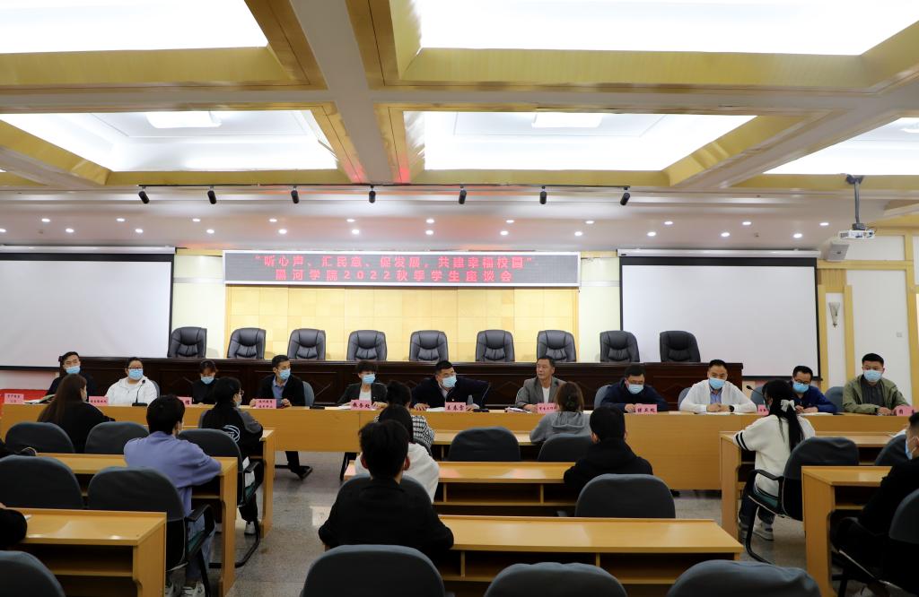 本网讯(特约记者 杨智超 摄影 郭瑞)全面了解广大学生对学校教育教学、管理服务等方面的意见建议,9月7日下午,学校在明德楼五楼报告厅举行“喜迎二十大 听心声 汇民意 促发展 共建幸福校园”2022级学生座谈会。党委副书记王春雷出席会议并讲话,各部门相关负责人、各学院学生代表参加会议。会议由学生工作部负责人主持。