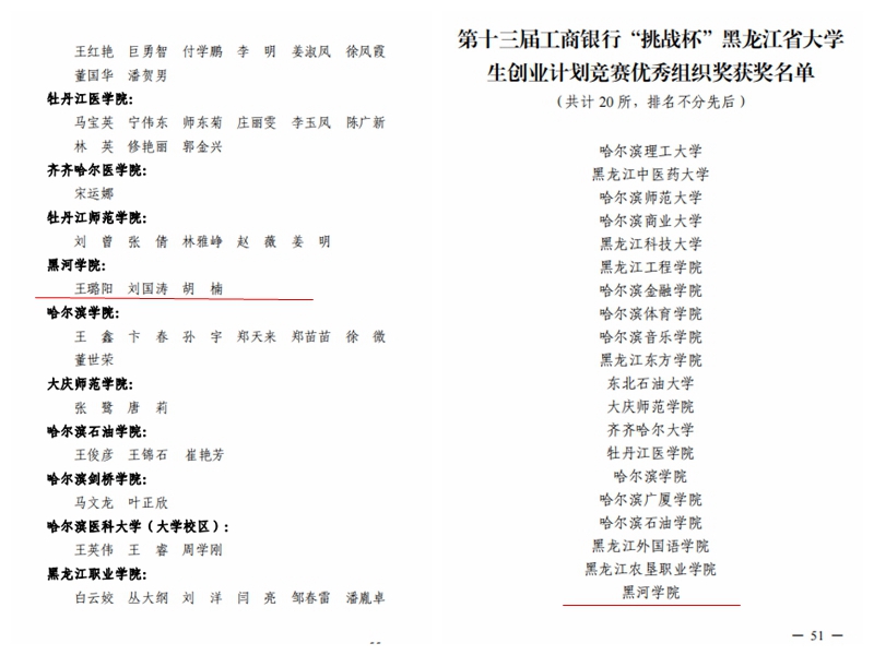 本网讯(特约记者 潘潇)近日,由共青团黑龙江省委员会、省教育厅、省人力资源和社会保障厅、省科学技术协会、省学生联合会主办的第十三届工商银行“挑战杯”黑龙江省大学生创业计划竞赛落下帷幕。我校参赛团队以高质量的项目内容,良好的精神风貌,在本次竞赛中取得了优异成绩。