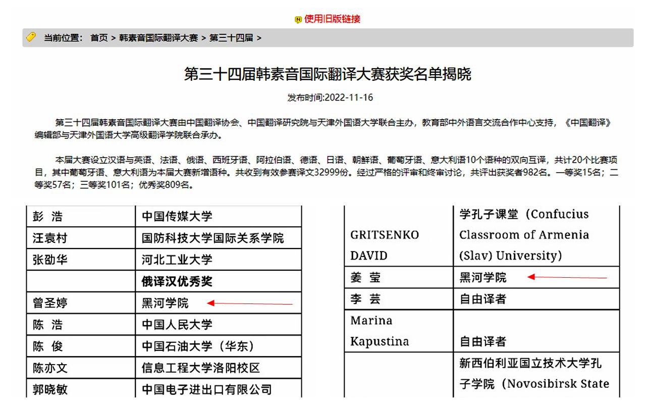 本网讯(特约记者 刘迪)11月16日,中国翻译协会官网公布第三十四届“韩素音国际翻译大赛”结果,我校外国语学院2019级翻译专业学生曾圣婷获俄译汉组优秀奖,2016级俄语专业毕业生辛梓有获俄译汉组优秀奖;教师姜莹获汉译俄组优秀奖。这是我校学生首次在该项比赛中获得奖项。