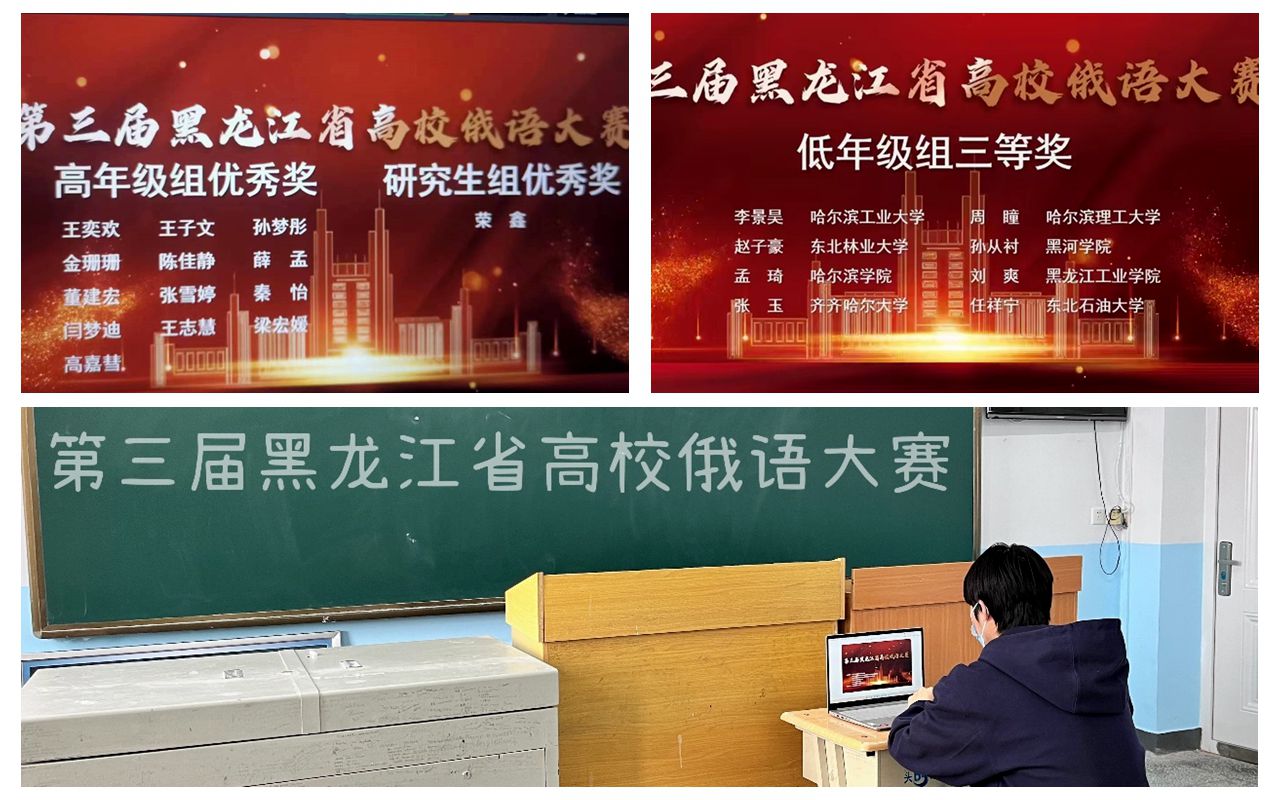 为强化人才培养质量意识,进一步鼓励大学生创新创业,提升黑龙江省高校俄语专业学生的语言文化知识及言语技能,11月18—19日,由黑龙江省教育厅高等教育处、黑龙江省高等学校外国语言文学类专业教学指导委员会、黑龙江省普通高等学校创新创业教育指导委员会、黑龙江省高等教育学会、黑龙江省俄语学会、黑龙江省俄语教学研究中心共同主办,哈尔滨理工大学承办的第三届黑龙江省高校俄语大赛在云端举行。本届赛事吸引了省内23所高校的58名大专生、本科生、研究生报名参加,经过激烈角逐,我校2021级学生孙从衬荣获低年级组三等奖,2020级学生王子文获得高年级组优秀奖,展现出扎实的语言基础与深厚的综合素养,展示了北疆俄语人的风采和魅力。
