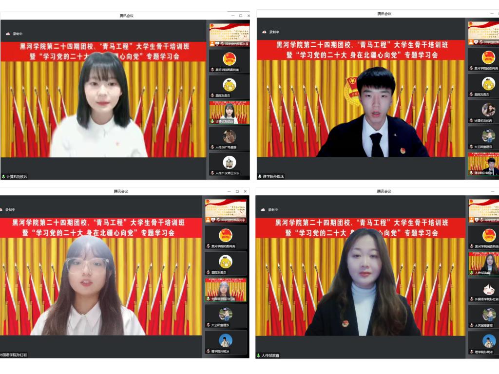 按照疫情防控要求,本期培训在线上开展了“四讲两论一测”等形式的学习活动。专题培训环节,齐齐哈尔大学党的创新理论宣讲团成员、齐齐哈尔市青年讲师团成员、齐齐哈尔大学团委副书记马小华教授,为学员们讲授了题为“高举旗帜、凝聚力量、踔厉奋发、勇毅前行——党的二十大报告解读”专题讲座;黑龙江省青年讲师团成员、共青团黑龙江省委党史宣讲团成员、东北大学马克思主义学院王馨副教授,我校马克思主义学院周长美、李红红老师分别为学员们作题为“以青春之我,弘扬伟大建党精神”“牢固树立和践行总体国家安全观,谱写新时代国家安全新篇章”“积聚青春力量 ‘点石’美丽中国”专题讲座。