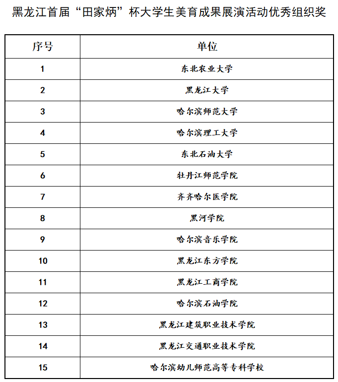黑龙江省首届“田家炳”杯大学生美育成果展演活动,由哈尔滨师范大学田家炳传媒文化教育研究中心承办,田家炳基金会(中国香港)协助,设置音乐与舞蹈类、美术类、戏剧与影视类三大类,分为专业组与非专业组两个组别。此次多项荣誉的取得,充分体现了我校美育和校园文化建设水平,展示了我校青年大学生昂扬的精神风貌。