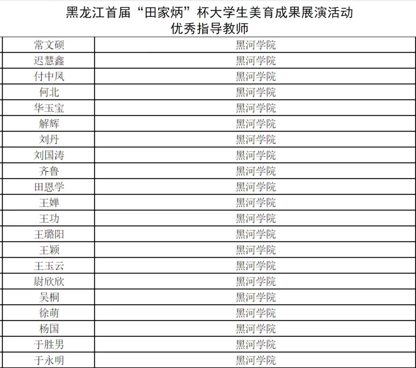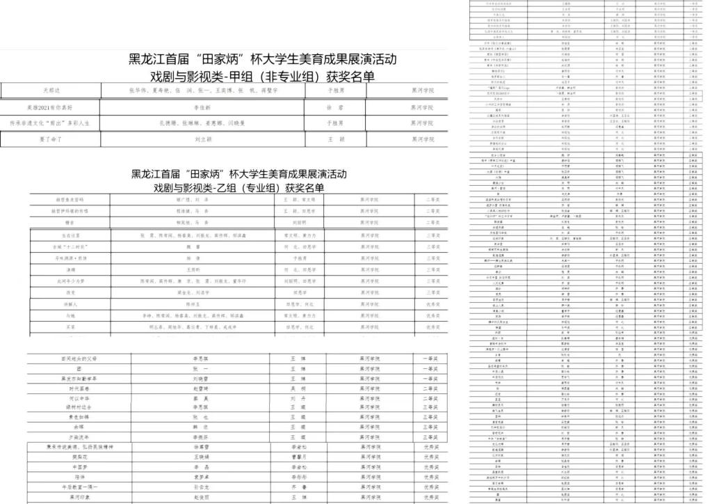 本网讯(特约记者 李娟)近日,省教育厅公布黑龙江省首届“田家炳”杯大学生美育成果展演活动获奖名单,我校择优推荐的395项作品,经专家评审,有137项作品分别在美术类甲组、美术类乙组、戏剧与影视类甲组、戏剧与影视类乙组4个组别中斩获一等奖11项、二等奖25项、三等奖46项、优秀奖55项;22名教师荣获“优秀指导教师奖”;我校荣获“优秀组织奖”。