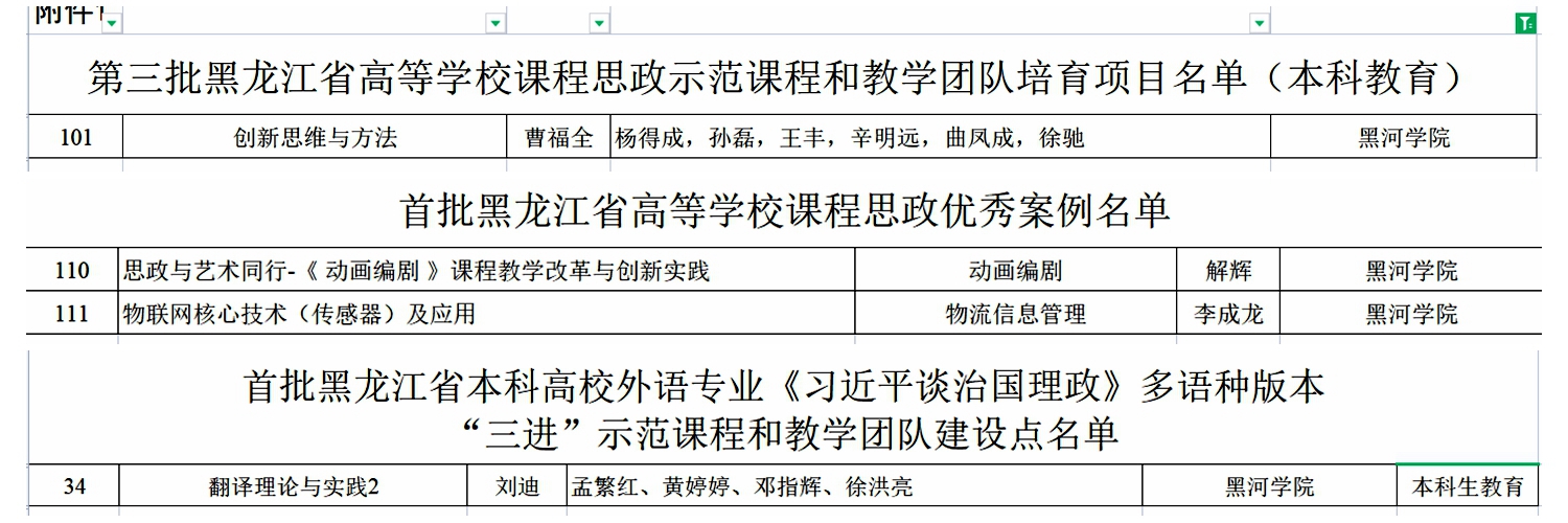 本网讯(特约记者 王虹丹)近日,省教育厅公布了黑龙江高校第三批课程思政示范培育项目、首批课程思政优秀案例、首批外语专业“三进”示范课程和教学团队建设点公示名单。我校Triz理论研究所曹福全老师的《创新思维与方法》课程确定为第三批黑龙江省高等学校课程思政示范培育项目;美术与设计学院解辉老师的《思政与艺术同行-<动画编剧>课程教学改革与创新实践》、经济管理学院李成龙老师的《物联网核心技术(传感器)及应用》确定为首批黑龙江省高等学校课程思政优秀案例;外国语学院刘迪老师的《翻译理论与实践2》及其课程团队确定为首批黑龙江省本科高校外语专业“三进”示范课程及教学团队建设点。