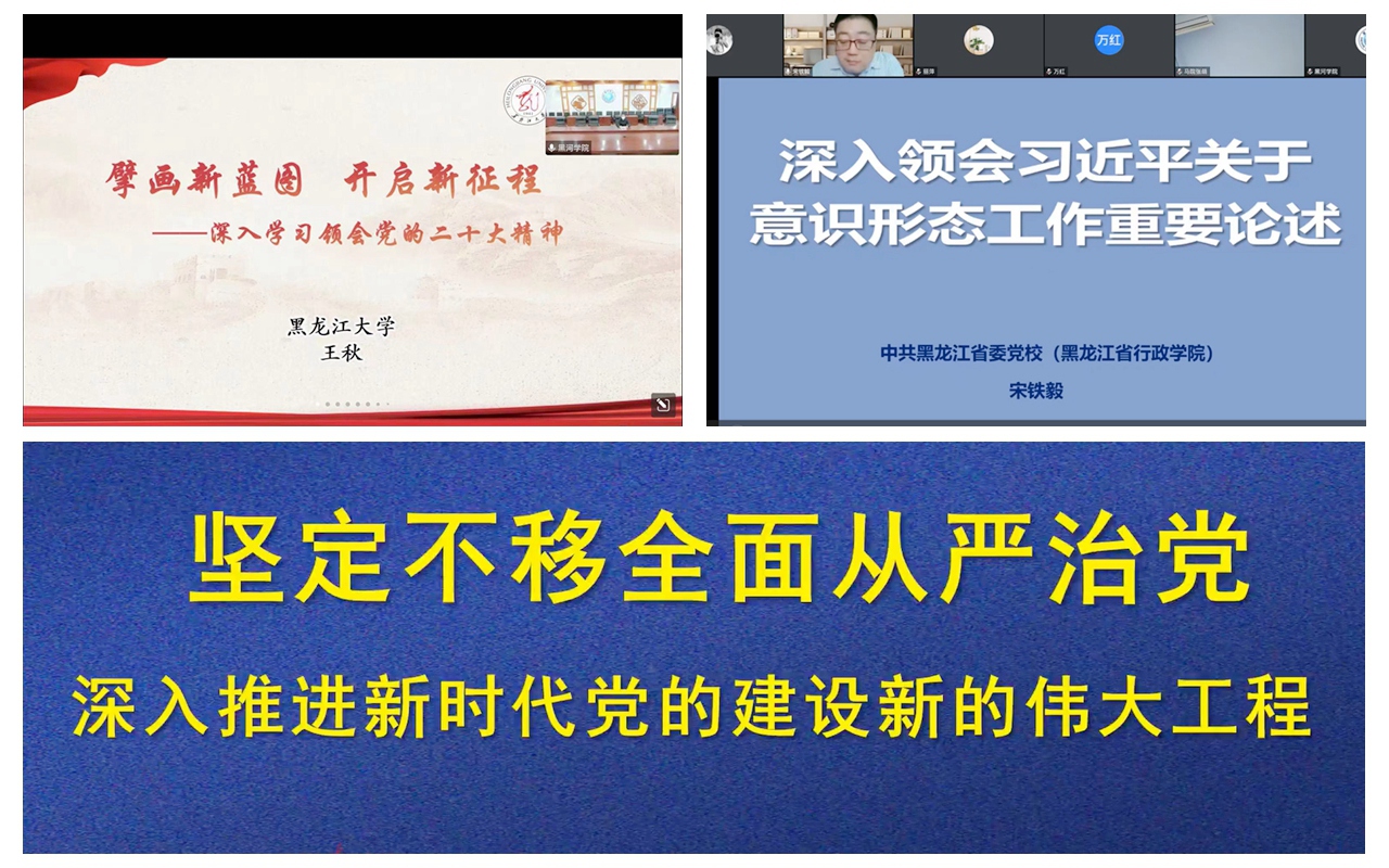 培训期间,学校特邀黑龙江大学和省委党校专家、学者以“擘画新蓝图 开启新征程——深入学习领会党的二十大精神”“深入领会习近平关于意识形态工作重要论述”“坚定不移全面从严治党——深入推进新时代党的建设新的伟大工程”为题作主题宣讲;党员教师通过专题辅导、直播讲堂、交流研讨、个人自学等方式,完成了规定课程学习任务。通过此次培训,全体参训学员对党的二十大精神有了更加全面的理解和把握,实现了预期目标,达到了培训效果。