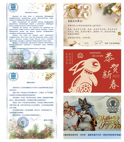在中国传统兔年春节到来之际,与我校友好交往的俄罗斯阿赫姆国立大学、俄罗斯阿穆尔国立大学、俄罗斯哈巴罗夫斯克国立文化学院、俄罗斯东北联邦大学涅留恩格里分校纷纷向我校发来新春贺信,并向我校全体教职员工致以新春祝福。