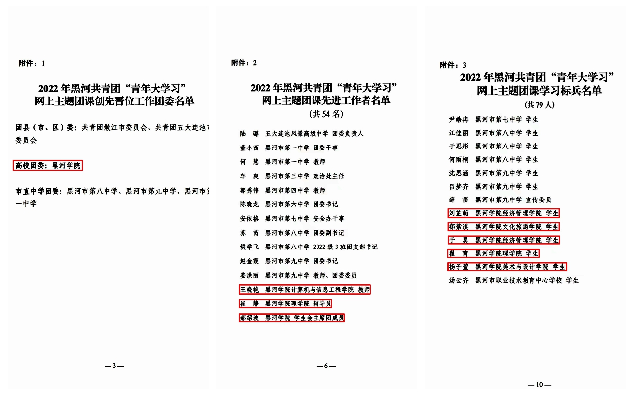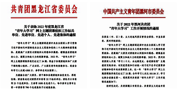 我校校团委被授予2022年黑龙江省“青年大学习”网上主题团课组织工作“标兵单位”称号;我校校团委、教育科学学院团委、计算机与信息工程学院团委、理学院团委、文化旅游学院团委5个团委被授予全省“青年大学习”网上主题团课组织工作“先进集体”称号;我校肖尧、白云涛、张宇、朱秋潼、杨茹、付仁蕾、董雪婷、郭雪梅8人被授予全省“青年大学习”网上主题团课组织工作“先进个人”称号。我校校团委被授予2022年黑河共青团“青年大学习”网上主题团课创先晋位工作团委称号;我校王晓艳、崔静、郝绍波3人被授予2022年黑河共青团“青年大学习”网上主题团课先进工作者称号;我校经济管理学院刘芷萌、文化旅游学院郗紫淇、经济管理学院于昊、理学院翟育、美术与设计学院杨子萱5人被授予2022年黑河共青团“青年大学习”网上主题团课学习标兵称号。