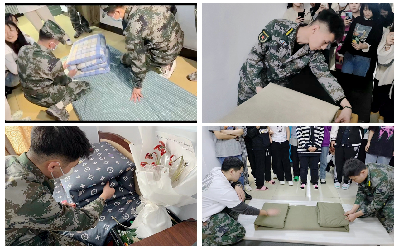 教官们严格按照标准摆放物品、叠放被褥,边示范边讲解要领,同学们在教官指导下,进行内务整理实操,一床蓬松的棉被在看似简单的“叠、压、捋”几个动作之下,变成了四四方方的“豆腐块”棱角分明。