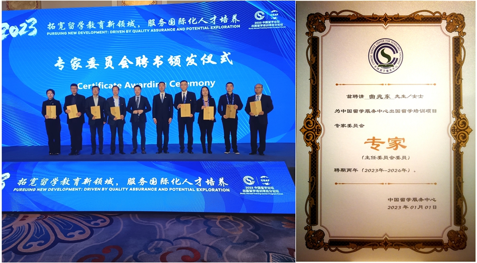 为进一步推进出国留学培训项目高质量发展,共同做好标准制定、质量保障、品牌建设等工作,2022年12月,中国(教育部)留学服务中心成立了首届出国留学培训项目专家委员会。论坛期间,中国(教育部)留学服务中心领导为出国留学培训项目建设成果突出的八所高校专家颁发“主任委员会”委员证书,这八所高校是北京外国语大学、中央财经大学、广东外语外贸大学、上海财经大学、东北财经大学、苏州大学、黑河学院、中国石油大学(华东)。之后,中心领导为其他54所高校专家颁发专家证书。我校国际教育学院院长曲兆东教授成功入选主任委员会委员。
