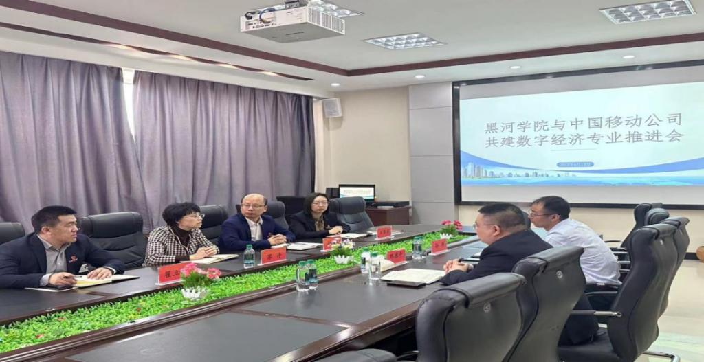本网讯(特约记者 翟立强)为进一步推进校企共建数字经济专业,创新校企“协同育人”人才培养模式,全面深化产学研合作,落实《黑河学院 中国移动通信集团黑龙江有限公司战略合作框架协议》,4月13日,我校与移动公司在求知楼B505召开共建数字经济专业推进会。移动公司黑河分公司政企事业部主任邹德平、政企事业部重客中心客户经理孙涛及我校教务处负责人、经济管理学院班子成员参加会议。