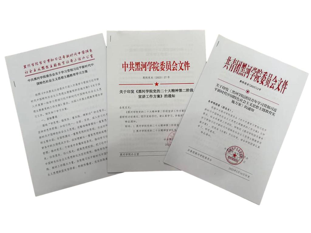 各部门协同联动,制定实施方案全覆盖。制定《中共黑河学院委员会关于学习贯彻习近平新时代中国特色社会主义思想主题教育学习计划》《黑河学院党的二十大精神第二阶段宣讲工作方案》,制定离退休党员关于主题教育的实施方案,坚持“送学上门”,听取他们对主题教育的感想,真正做到不漏学、不掉队;制定青年学生主题教育的实施方案,以联学、联讲、联行、联创、联演、联赛、联展“七项联动”为重要抓手,明确重点工作任务。
