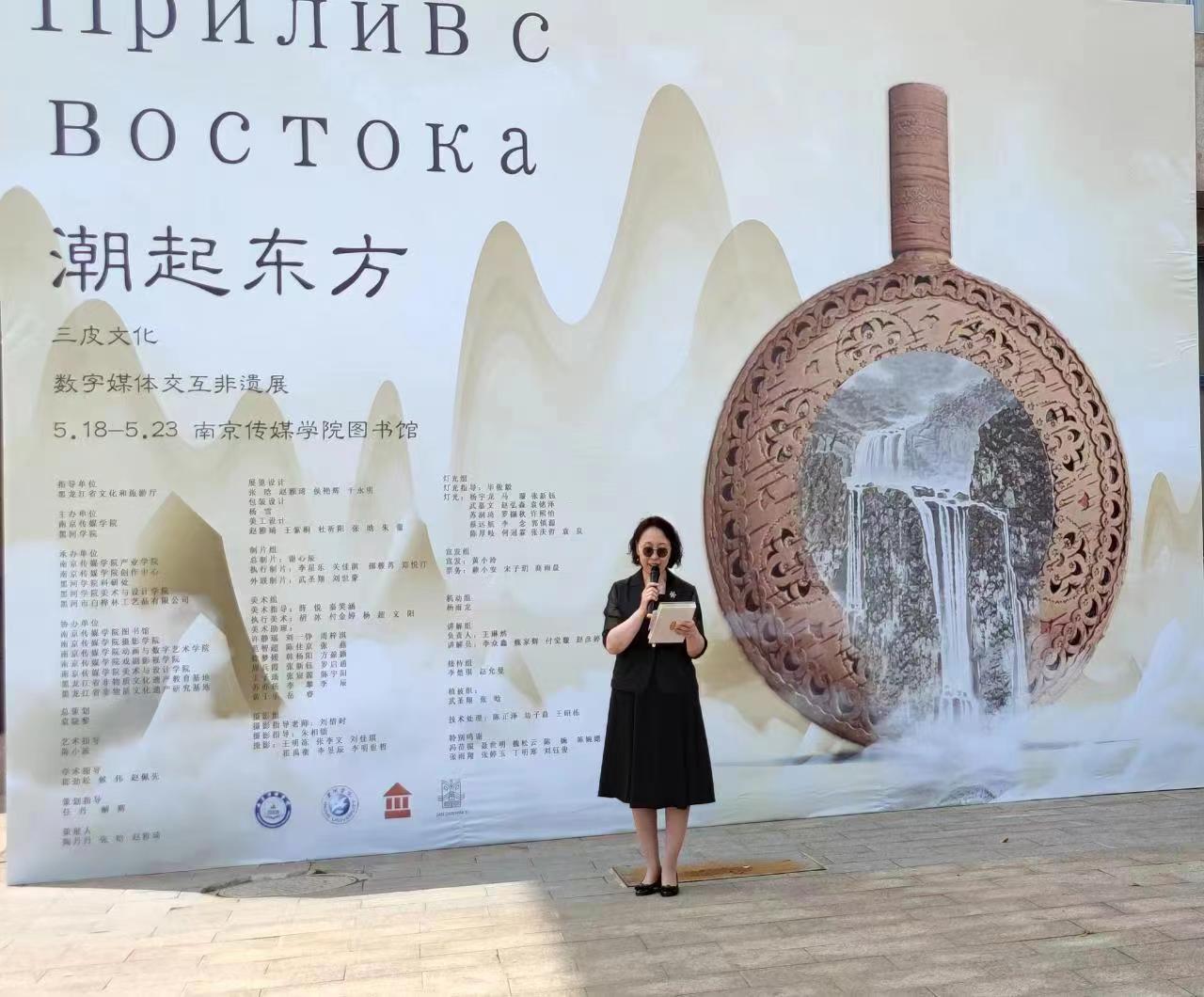 本网讯(特约记者 解辉 于永明)5月18日,由黑龙江省文化和旅游厅指导,黑河学院与南京传媒学院共同举办的“潮起东方——三皮文化数字媒体交互非遗展”首展在南京正式启动。黑龙江省文化和旅游厅二级巡视员张亚巍、南京传媒学院副校长袁晓黎、张鸿声、陈晓波,我校党委委员、副院长谢慧,美术与设计学院院长解辉、黑河市委宣传部副部长王秀玲、黑龙江省文化和旅游厅非遗二处主任科员王蓉、学校省级非遗传承人陶丹丹教授出席启动仪式。
