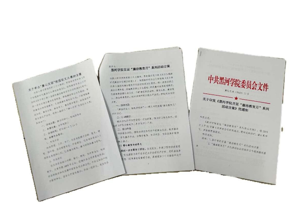做好顶层设计,强化组织领导,按下廉洁文化传播的“启动”键。学校党委高度重视,制定并下发《黑河学院首届“廉洁教育月”系列活动方案》,及时召开专题会议研究部署相关工作,牵头部门统筹协调,各责任部门密切配合,根据分工制定子方案,细化工作责任,明确工作内容,注重工作时效,积极合力推动各项活动深入开展并高质量完成。