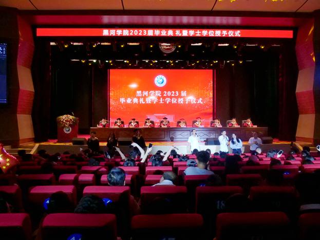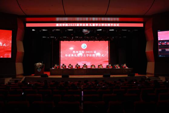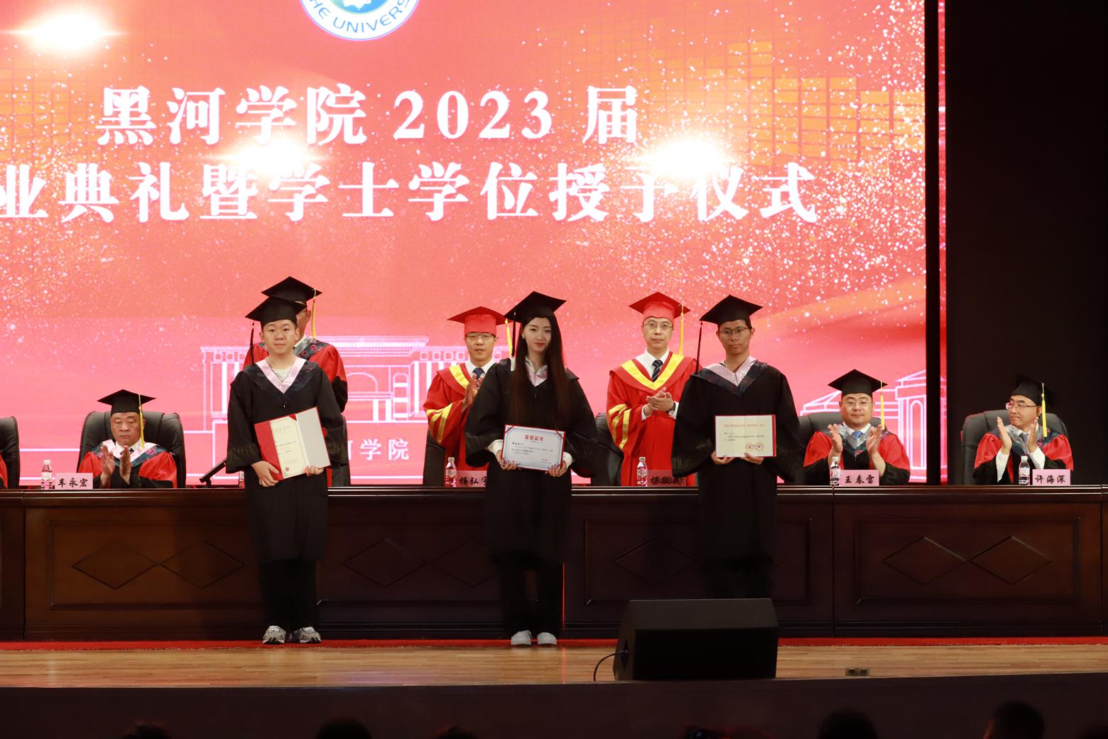 毕业典礼在雄壮的国歌声中拉开序幕。学校学位评定委员会副主席、副院长许海深宣读了黑河学院2023届本科毕业生名单和学士学位授予名单;党委副书记王春雷宣读了2023届优秀毕业生名单、优秀毕业生党员名单、2019级优秀实习生和优秀顶岗实习支教生名单。与会校领导为2023届优秀毕业生、优秀毕业生党员和优秀实习生代表颁发了获奖证书。