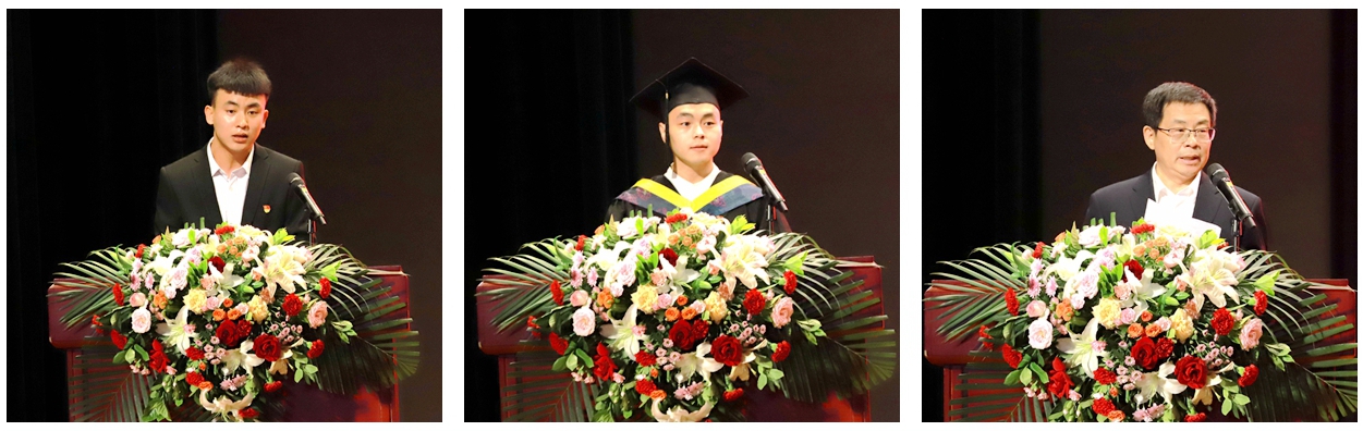在校生代表体育学院陆佳伟表示,将带着学长学姐们的期盼,勤于实践,积极进取,续写新的篇章。毕业生代表计算机与信息工程学院刘浩然分享了自己在大学探索未来道路的四年光阴,感恩父母养育,感谢导师教诲,不忘母校培养,坚持梦想、不忘初心,注重细节、精益求精,勇挑重担、心怀家国。黑龙江省TRIZ理论研究中心主任曹福全教授代表全体教师发言,激励毕业生们在平凡的工作岗位上,干一行爱一行,爱一行钻一行,钻一行通一行,在平凡中坚守初心、砥砺奋进,在平凡中追求卓越,奉献国家。在热烈的掌声中,党委副书记、院长杨敬民为毕业生代表拨正流苏、颁发学位证书,并寄语毕业生“坚守人生底色,绘就壮美画图”。