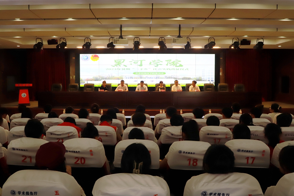 爱辉区海兰街道办主任薛思学,我校党委副书记王春雷出席会议;学生工作部、招生就业处、教务处、各学院、团委相关工作负责人,分管社会实践的辅导员老师和学生代表400余人参加出征仪式。