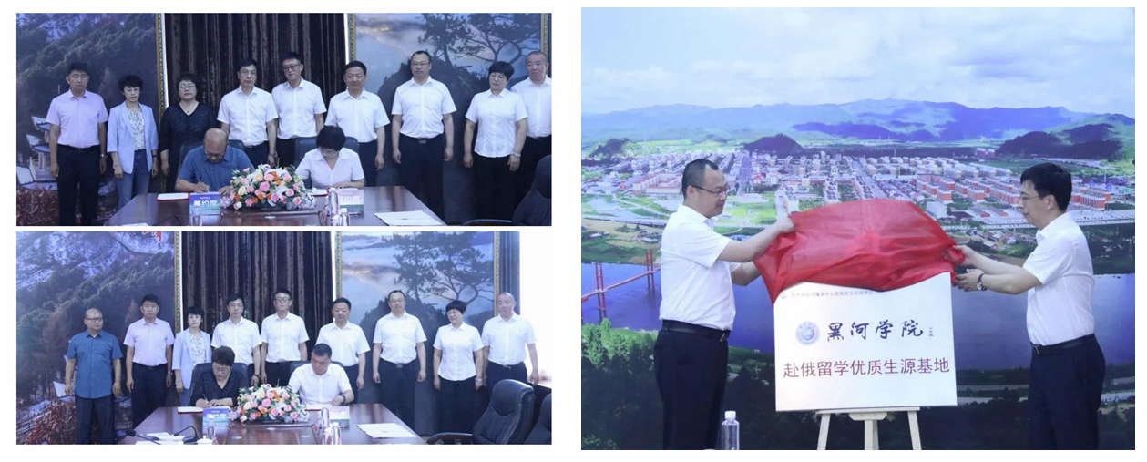 谢慧介绍了我校顶岗实习、国际化人才培养等对外合作项目情况。在与会领导共同见证下,双方签署了《伊春市金林区与黑河学院合作框架协议》和《联合办学协议》等合作协议。杨敬民与伊春市教育局局长梁宏共同为“黑河学院赴俄留学优质生源基地”揭牌。