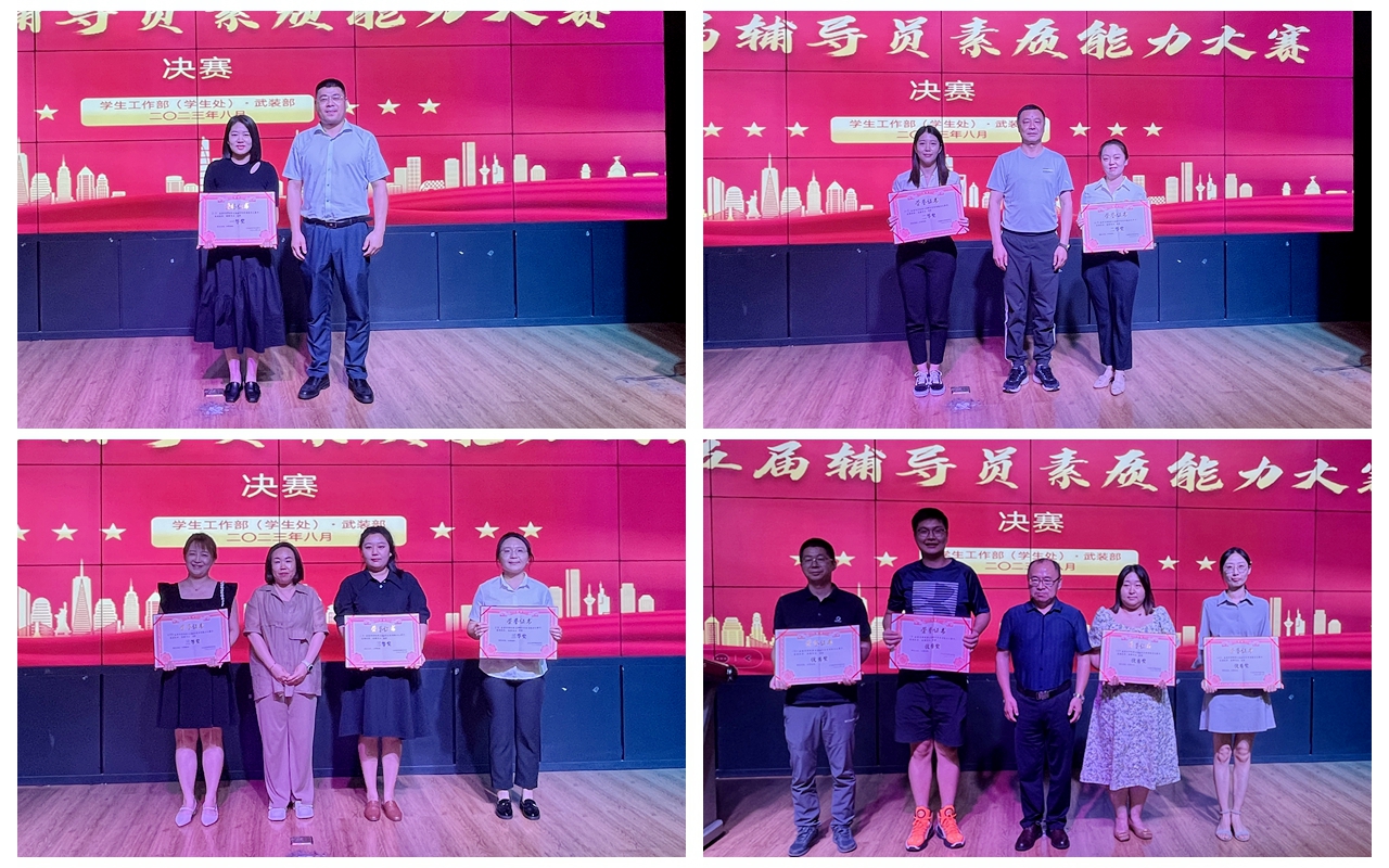 第五届辅导员素质能力分为初赛“基础知识测试”“学生信息辨识”,决赛“案例研讨”“育人故事分享”四大环节,全面考察辅导员综合运用理论分析问题、解决问题的能力,经过激烈角逐,文化旅游学院杨茹荣获一等奖;人文传媒学院赵宇、外国语学院赵杨两名辅导员荣获二等奖;理学院崔静、美术与设计学院方悦、体育学院郭雪梅三名辅导员荣获三等奖;教育科学学院孙晓红、教育科学学院李岩松、体育学院于博、经济管理学院王希顺四名辅导员荣获优秀奖。