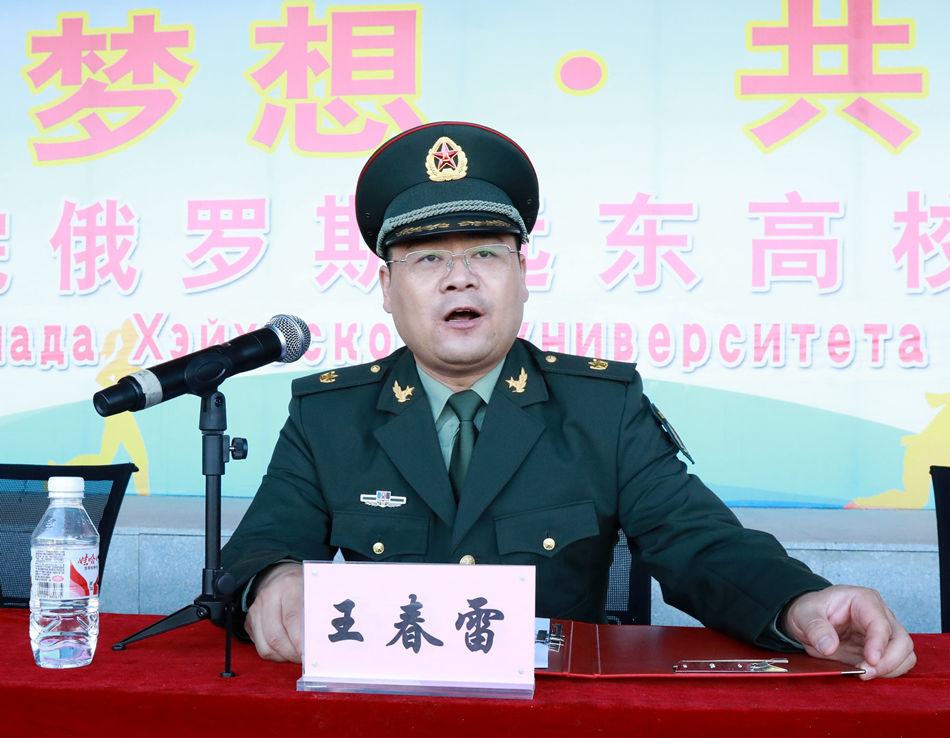 王春雷代表学校向顺利完成军训任务的学生,以及在这次军训中荣获表彰的集体和个人表示热烈的祝贺;感谢由36名退役复学学生和5名国旗护卫队学生组成的教官团队,感谢全体跟训老师和为本次军训提供后勤保障服务的全体军训工作人员。选择黑河学院,是同学们人生中的第一次重要选择,四年里,你们会有很多难忘精力,为期一周的军训,就是那难忘的一课,课堂上同学们滋养品德,培养创新技能,吸收中国传统文化和应用型知识的营养,具备了中国精神,中国灵魂,希望同学们把军训中养成的军人作风保持下去,带到我们学习和生活中,努力规范自己的言行,健全自己的人格,牢固树立集体观念,做文明学生,共创文明班级,共建文明校园。