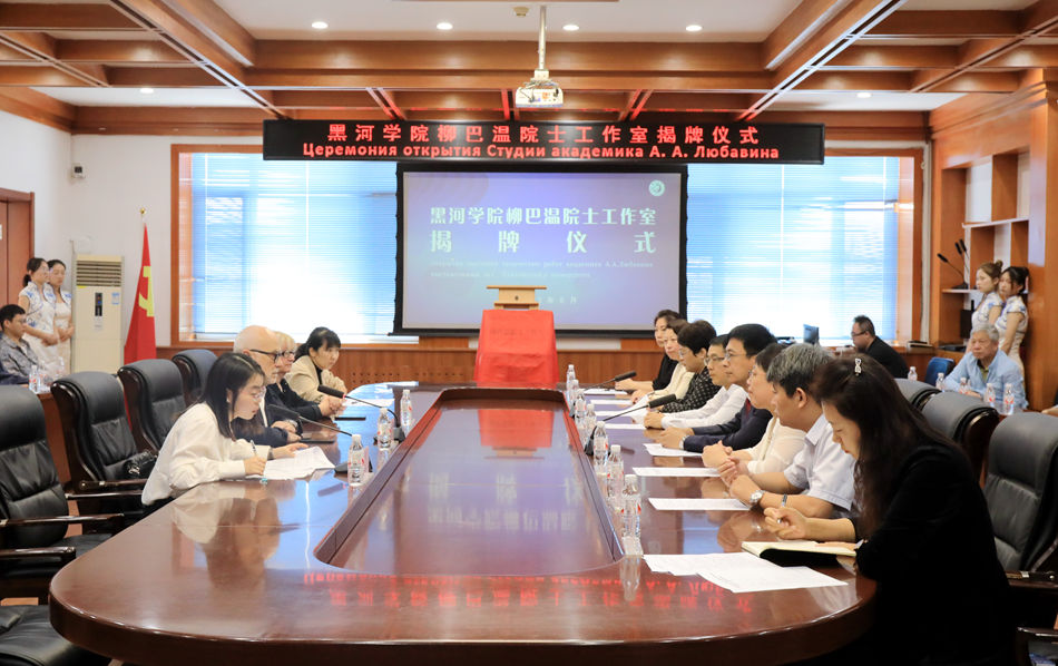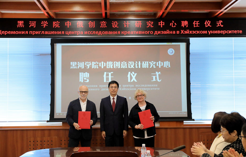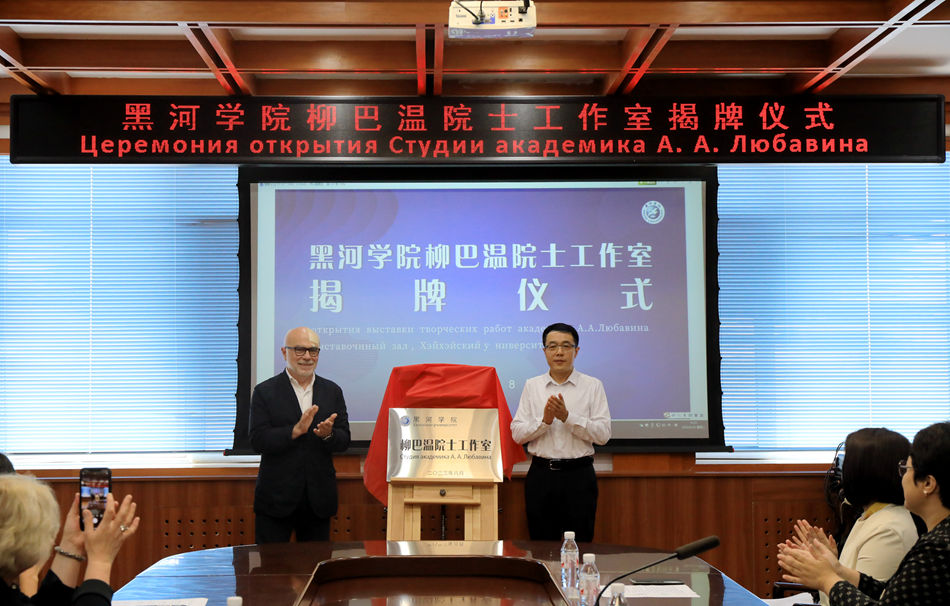 杨弘宇、柳巴温•阿纳托利•亚历山德罗维奇共同为“黑河学院柳巴温院士工作室”揭牌;杨敬民分别为柳巴温院士颁发“黑河学院中俄创意设计研究中心”名誉主任聘书,为吉娜·柳巴温颁发“黑河学院中俄创意设计研究中心”特聘教授聘书。