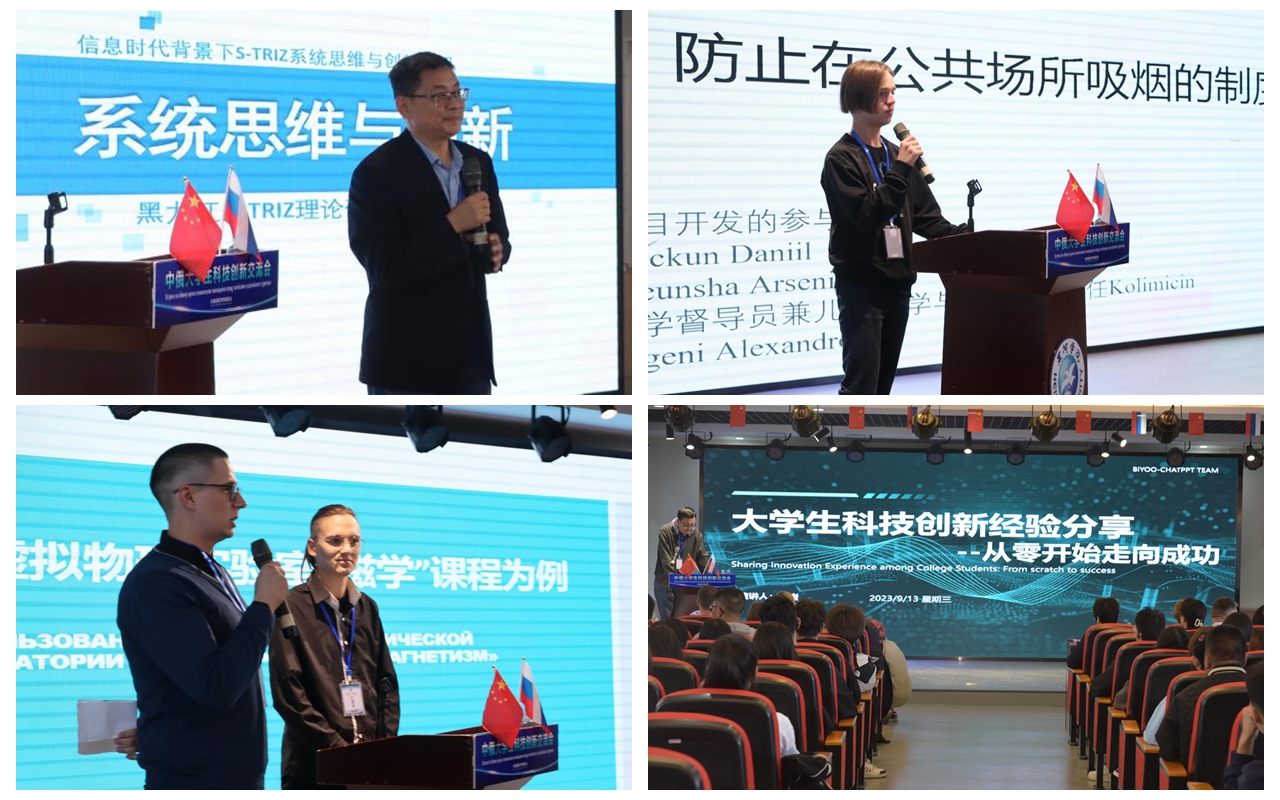活动期间与会专家学者就40项创新创业研究成果进行精彩的学术分享。学校TRIZ理论研究所所长、创新创业学院副院长曹福全教授以“系统思维与创新”为题,深度挖掘中俄大学生思维的多角度转变,指导大学生发挥创新优势,多维度思考创新方式方法。学校计算机与信息工程学院教师李岩,以“大学生科技创新经验分享-从零开始走向成功”为题,就大学生科技创新项目的设计与实施、团队建设和管理、创新资源获取与利用等方面进行了经验分享。布拉戈维申斯克国立师范大学学生,斯图昆·达尼尔·亚历山德罗维奇和理恩莎·阿尔谢尼·马克西姆维奇交流了他们团队最新的研究科技创新项目“公共场所的禁烟系统”。布拉戈维申斯克国立师范大学学生,扎伊采夫·罗曼·康斯坦丁诺维奇、梅尼科·阿纳斯塔西娅·谢尔盖耶夫娜和莎罗娅·拉斐尔·谢尔盖耶维奇团队分享了他们的研究课题“以虚拟物理实验室‘磁学’课程为例”。学校学生张明远以“in safe全方位智能急救先知者-智能急救手环”科技创新项目进行了交流。