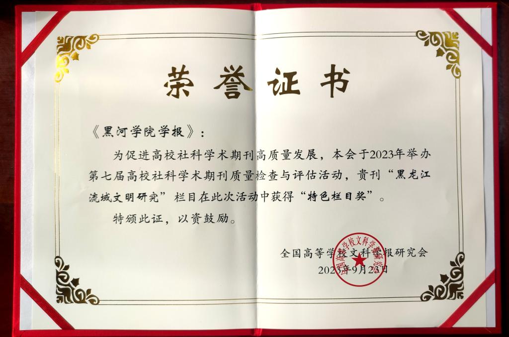 全国高等学校文科学报研究会是教育部直属的国家一级学会,定期组织全国性高校社科学术期刊评优活动。此次质量检查与评估活动采取自愿申请、统一评分、专家讨论结合的办法,目的在于促进高校社科学术期刊高质量发展。《黑河学院学报》“黑龙江流域文明研究”栏目继2019年获此荣誉后,在新的评审中又一次得到学会对我刊办刊质量和办刊方向的充分肯定。