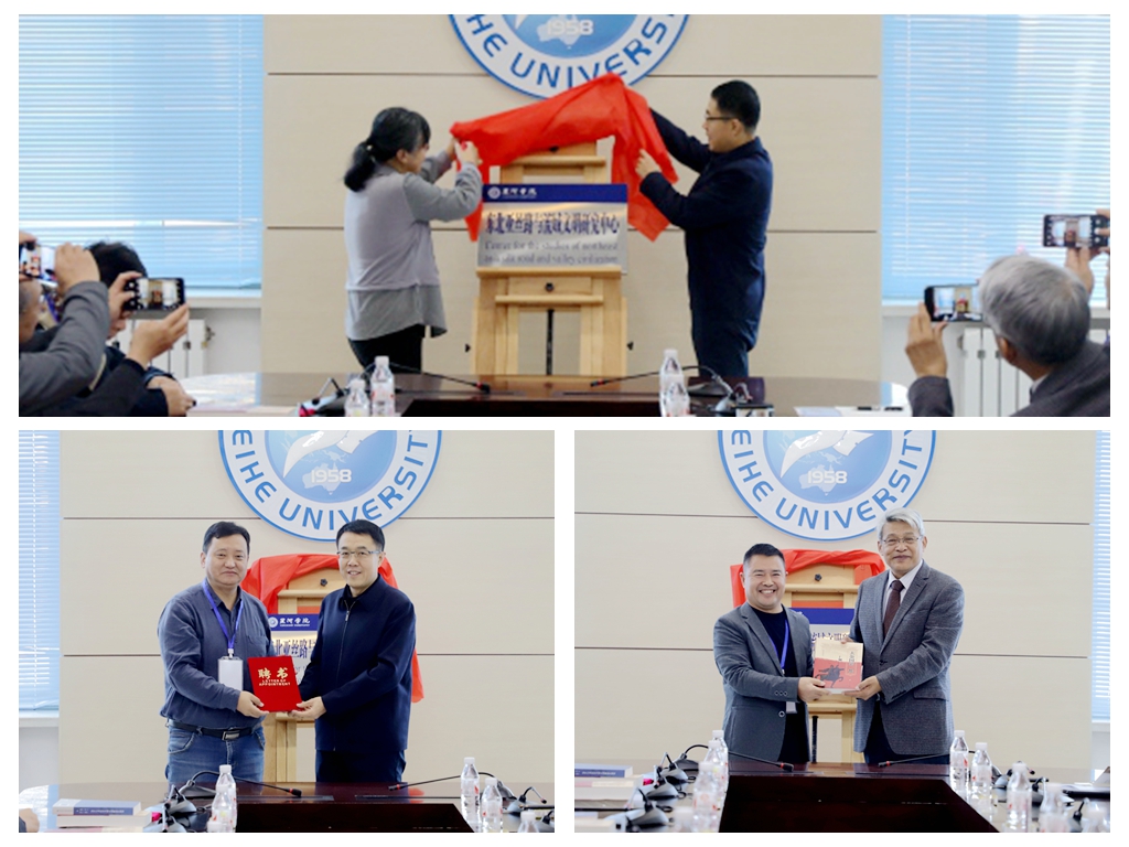 期间,杨弘宇与中国社会科学院古代史研究所研究员、博士生导师李锦绣共同为东北亚丝路与流域文明研究中心揭牌;杨弘宇为学校聘请的12位特聘研究员代表颁发聘书;金上京历史博物馆副馆长郭万勋向我校东北亚丝路与流域文明研究中心主任王禹浪赠送图书《大金国第一都》。